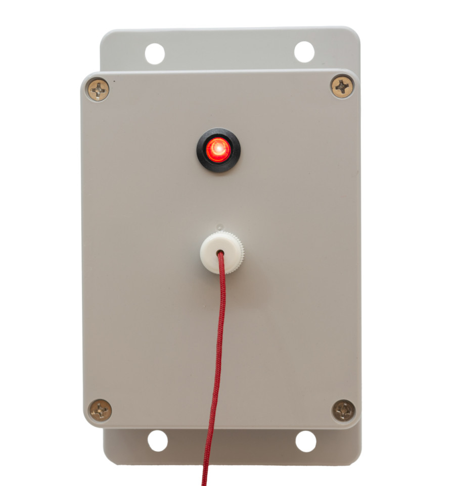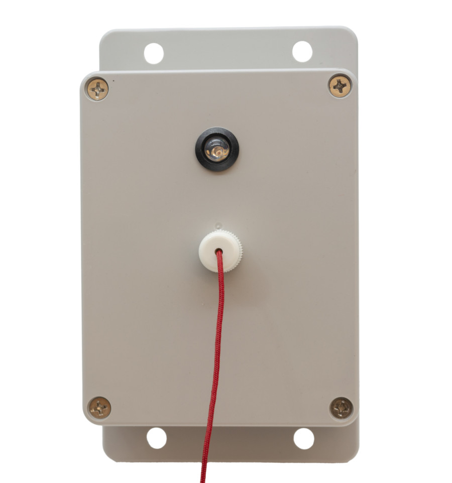 When the pull-cord switch is activated, it sends a long-range wireless signal to the siren assembly. This triggers the built-in siren and flashing LED, which stays latched on until the reset button (located at the bottom of the unit) is pressed.