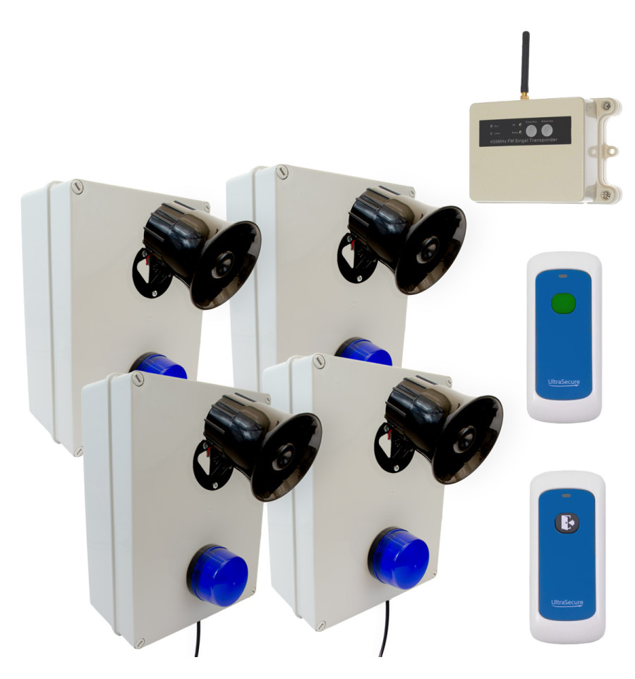Wireless Lockdown Control Boxes with Blue Strobes, Loud 118dB Sirens, Signal Repeater, Portable Trigger & Stop Buttons