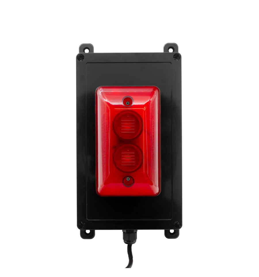 The panic system box is equipped with a powerful 110 dB siren and a high-intensity red flashing strobe for immediate audible and visual alerting.