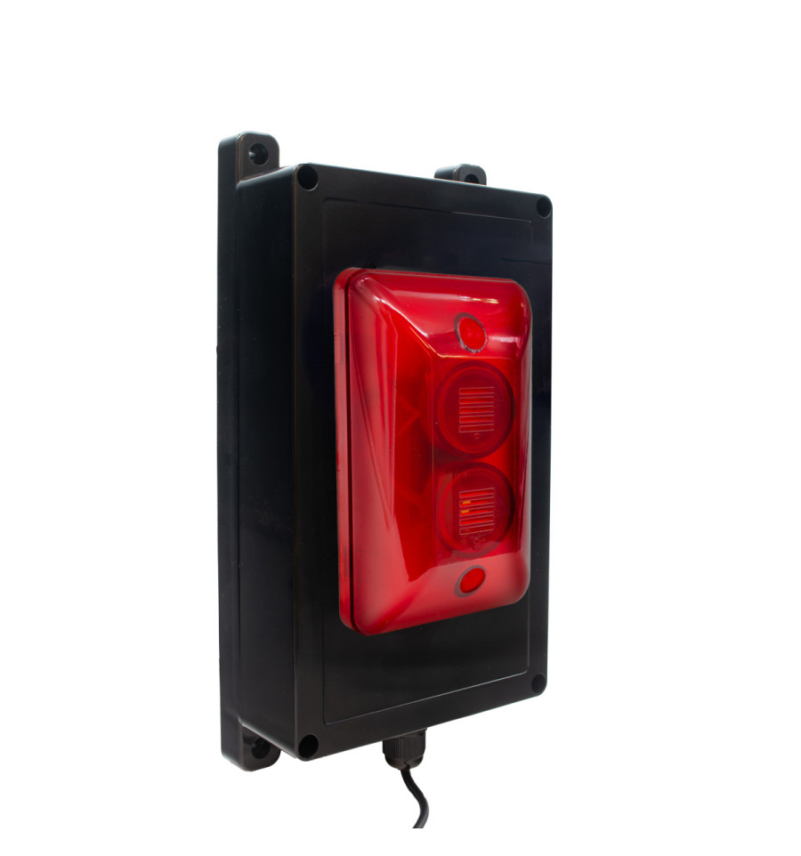 The panic system box is equipped with a powerful 110 dB siren and a high-intensity red flashing strobe for immediate audible and visual alerting.